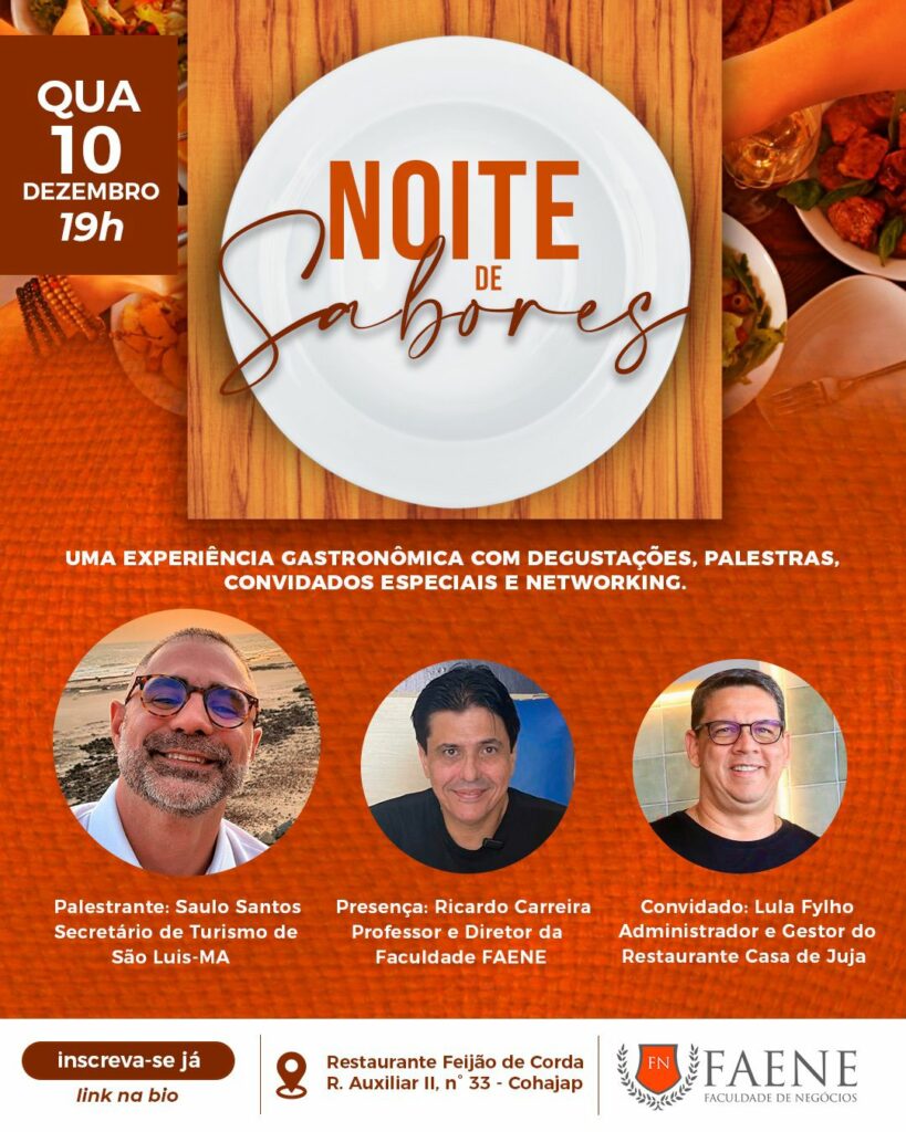 SÃO LUÍS -É nesta quarta-feira (10), às 19h, no restaurante Feijão de Corda, no bairro Cohajap, a Noite de Sabores, aula inaugural de mais uma turma do curso de MBA Gastronomia, Hotelaria e Eventos, com a presença de alunos, ex-alunos, professores e convidados