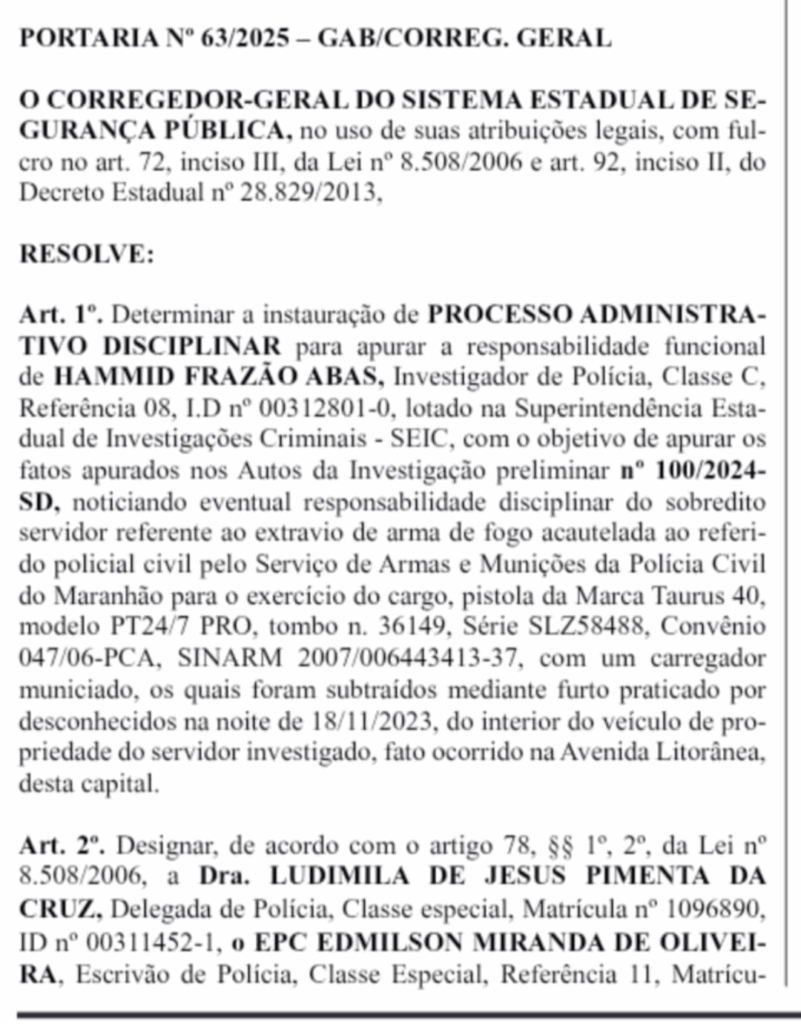 A Corregedoria Geral do Sistema de Segurança Pública instaurou processo administrativo disciplinar para apurar responsabilidade de um investigador da Superintendência Estadual de Investigações Criminais (Seic) sobre o furto de uma pistola Taurus .40 acautelada ao referido policial civil. A arma de fogo foi subtraída na Avenida Litorânea, na noite de 18 de novembro de 2023. A portaria referente à investigação foi publicada no Diário Oficial do Estado no último dia 17.