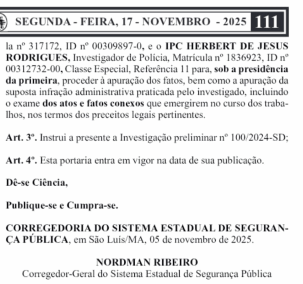 Assina o ato o corregedor-geral do Sistema Estadual de Segurança Pública, Nordman Ribeiro.