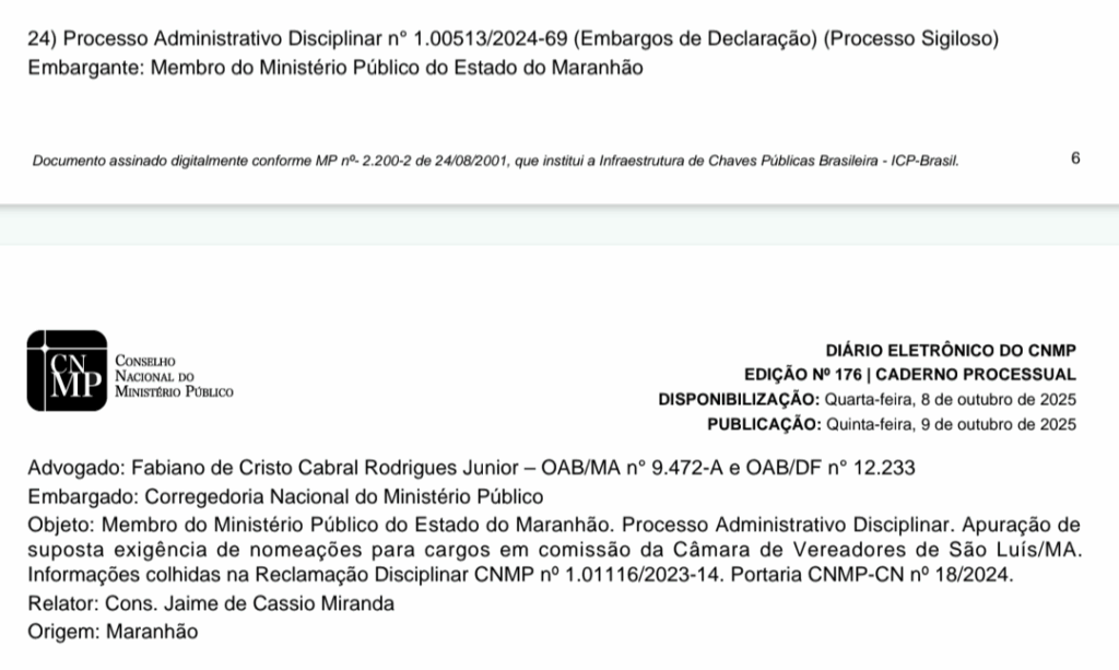 O processo que tem como réu o promotor de justiça Zanony Passos Silva Filho, afastado cautelarmente do cargo sob a acusação de extorsão contra o presidente da Câmara Municipal de São Luís, Paulo Victor, voltará à pauta do Conselho Nacional do Ministério Público na 4ª Sessão Ordinário de 2025, que será realizada entre os dias 16 e 20 de outubro em plenário virtual. Na ocasião, os conselheiros vão analisar e julgar embargos de declaração interpostos pelo Ministério Público do Maranhão. Também atua na causa o advogado Fabiano de Cristo Cabral Rodrigues Júnior. O relator é o conselheiro Jaime de Cássio Miranda. O processo corre sob sigilo.