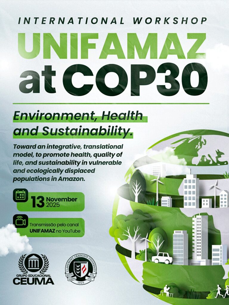 Belém (PA) / São Luís (MA) — 31 de outubro de 2025 — A Universidade Ceuma, por meio do Programa de Pós-Graduação em Meio Ambiente (PPGMA), reafirma seu protagonismo científico ao participar da programação paralela da COP 30 com o Workshop “Saúde, Meio Ambiente e Sustentabilidade”, que será realizado no dia 13 de novembro, na UNIFAMAZ (GRUPO CEUMA), em Belém (PA).