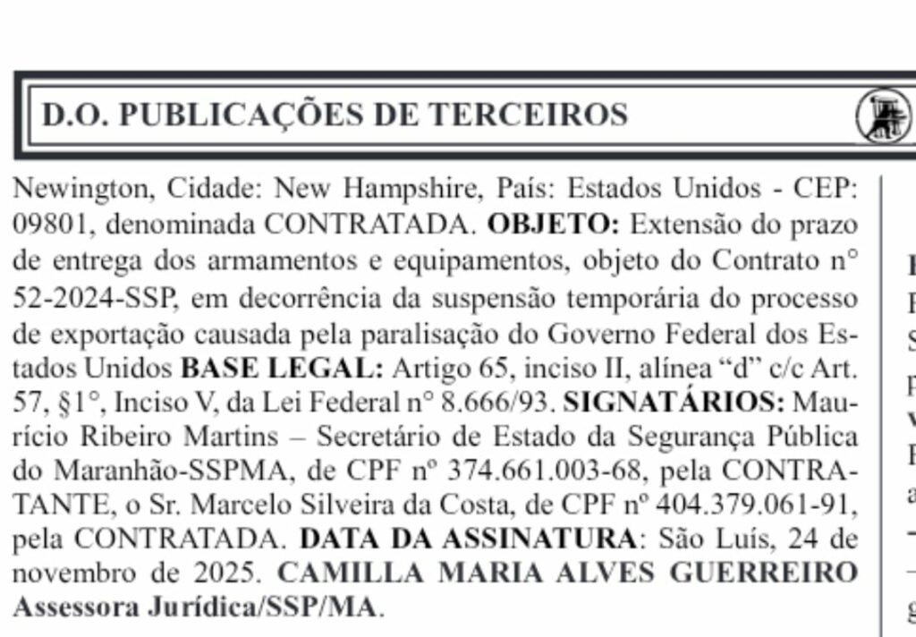 Em razão do atraso do fornecimento dos fuzis, a SSP foi obrigada a estabelecer um termo aditivo para formalizar a extensão do prazo de entrega dos armamentos e equipamentos “em decorrência da suspensão temporária do processo de exportação causada pela paralisação do Governo Federal dos Estados Unidos. O ato foi publicado no Diário Oficial do Estado em 27 de novembro.