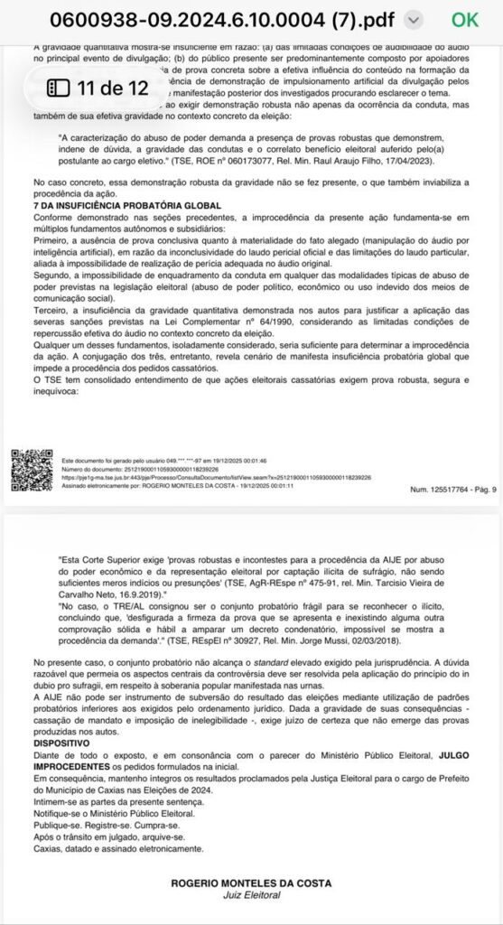 De forma clara, o juiz eleitoral afirmou que não foram apresentadas provas fortes que comprovassem as acusações feitas no processo. Por isso, os resultados anunciados oficialmente pela Justiça Eleitoral seguem válidos e sem qualquer alteração.