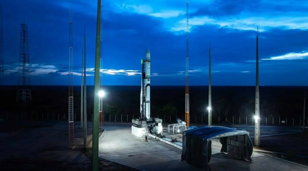 Foguete sul-coreano Hanbit-Nano na plataforma de lançamento da Base de Alcântara, no Maranhão