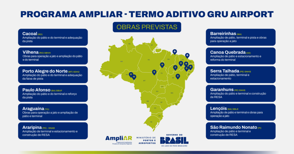 O Ministério de Portos e Aeroportos (MPor) assinou, nessa terça-feira (14), o termo aditivo que inclui 12 aeroportos regionais do Nordeste e da Amazônia Legal no contrato da GRU Airport. Com a medida, a concessionária do Aeroporto Internacional de Guarulhos amplia sua atuação e passa a administrar terminais nos estados do Ceará, Maranhão, Mato Grosso, Pernambuco, Piauí, Rondônia, Tocantins e na Bahia.