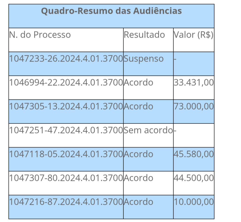 Ao todo, foram realizadas sete audiências, sendo que em cinco delas foram celebrados acordos. Somente em um processo não foi possível concluir a conciliação e outro precisou ser suspenso. O valor total acordado ficou em R$ 206.511,00.