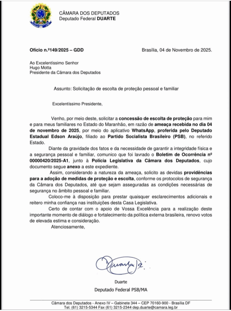 Abaixo, ofício encaminhado pelo deputado Duarte Jr. ao presidente da Câmara Federal, Hugo Mota, em que solicita escolta de proteção para si e para os seus familiares no Maranhão: