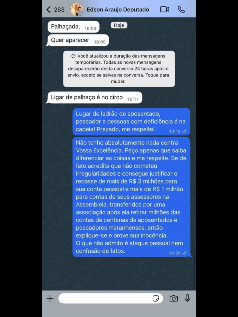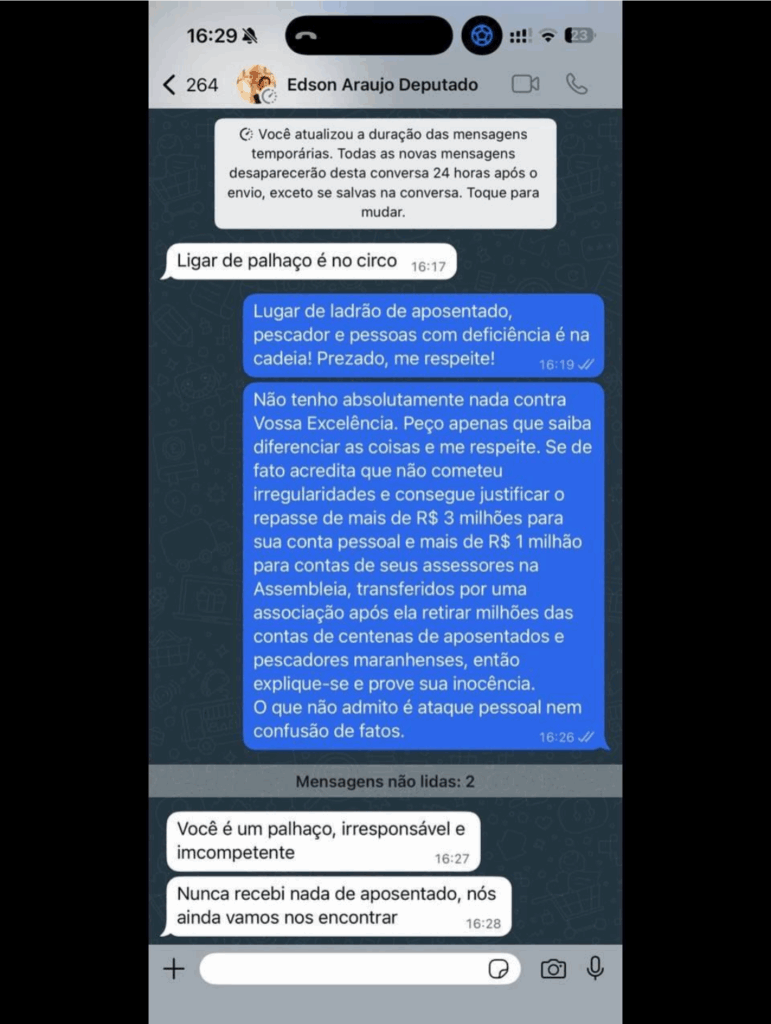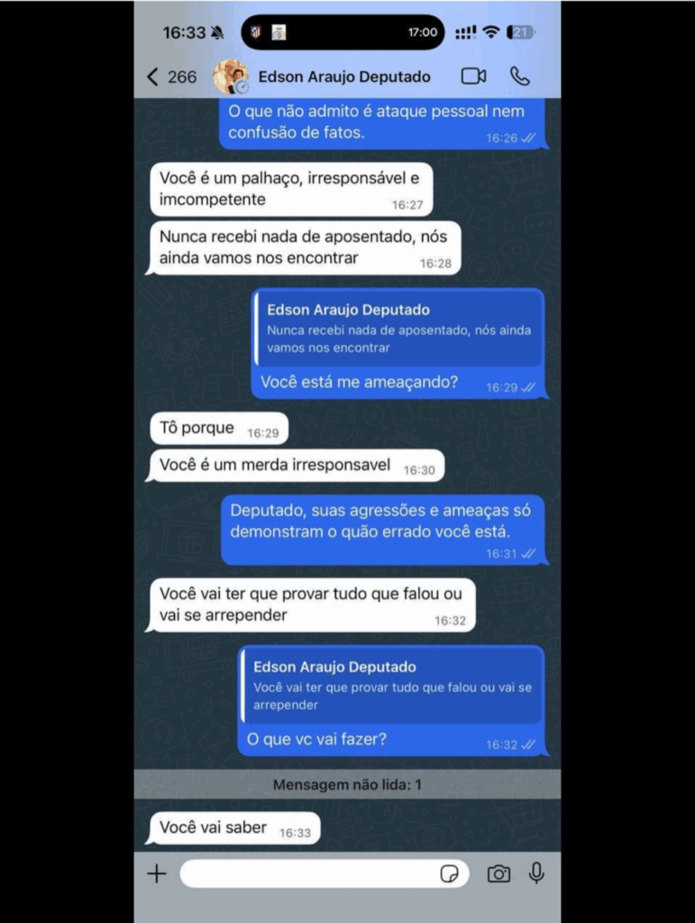 Leia o diálogo com as ameaças desferidas por Edson Araújo a Duarte Jr.: