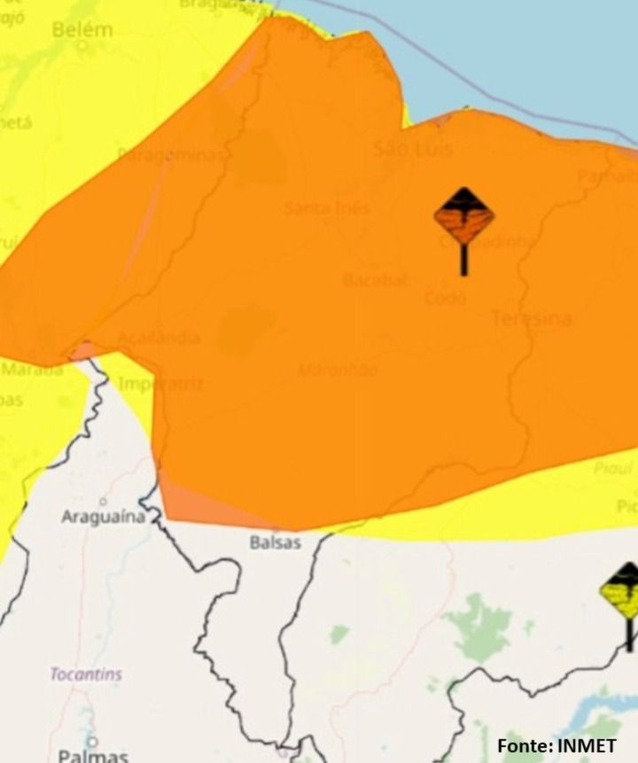 O Maranhão está sob alertas amarelo e laranja de chuvas intensas, emitidos pelo Instituto Nacional de Meteorologia (Inmet), válidos nesta segunda (26), terça (27) e quarta-feira (28). O alerta laranja, que representa perigo de chuvas intensas, atinge todas as regiões do estado, incluindo a Região Metropolitana de São Luís e municípios como: Barreirinhas, Santa Inês, Bacabal, Caxias, Timon, Codó, Barra do Corda, Açailândia, Imperatriz e diversos outros.