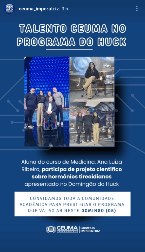 A aluna do curso de Medicina da Universidade Ceuma, Campus Imperatriz, Ana Luiza Ribeiro, participará do programa Domingão com Huck, da Rede Globo, neste domingo, 5 de outubro. A estudante apresentará o projeto científico sobre hormônios tireoidianos, que ganhou destaque no segmento acadêmico.