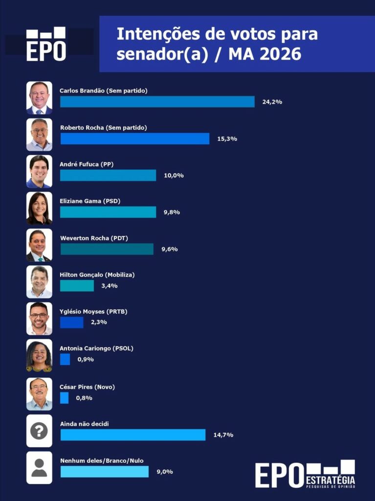 Pesquisa de opinião realizada pela EPO Estratégia também apurou as intenções de voto para senador no Maranhão. Dos nove candidatos que pontuaram na sondagem, o principal destaque é o governador Carlos Brandão (sem partido), que aparece na liderança, com 24,2%. Em segundo, vem Roberto Rocha (sem partido), com 15,3%.