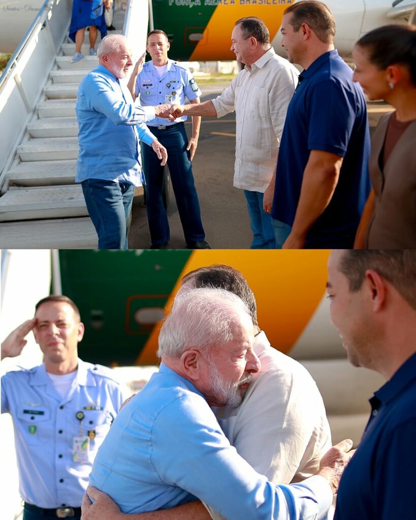 O governador Carlos Brandão recepcionou o presidente Luiz Inácio Lula da Silva no final da tarde desta segunda-feira (6) em Imperatriz, onde o petista cumpre agenda de entrega de unidades habitacionais do programa Minha Casa, Minha Vida. Brandão recebeu Lula na pista do aeroporto com um caloroso abraço e destacou a boa sintonia com o presidente da República.