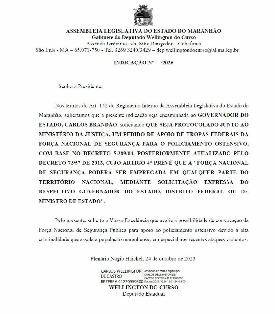 O deputado estadual Wellington do Curso apresentou, na manhã desta quinta-feira (24), uma Indicação solicitando ao governador Carlos Brandão que protocole, junto ao Ministério da Justiça, um pedido de apoio de tropas federais da Força Nacional de Segurança Pública para reforçar o policiamento ostensivo no estado.