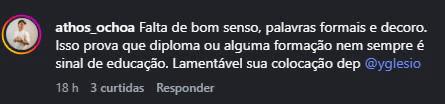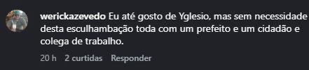 Nas redes sociais, a fala também gerou forte rejeição. Internautas criticaram a falta de bom senso e de decoro do parlamentar, classificando sua postura como “lamentável” e “desnecessária”. Outros questionaram o motivo de tamanha agressividade, afirmando que o prefeito apenas não teria aceitado “mandos e desmandos” do grupo Arruda. Até apoiadores tradicionais de Yglésio reprovaram o episódio, apontando que não havia justificativa para “esculhambação” contra um prefeito que o deputado sequer conhece. Houve ainda quem destacasse que o ataque expôs contradições políticas recentes do próprio parlamentar.