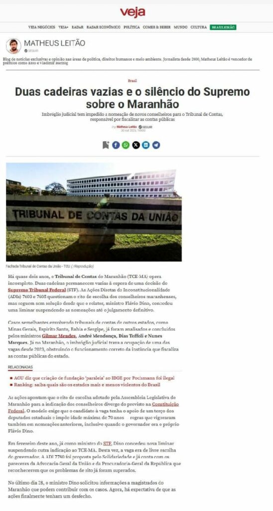 Casos semelhantes envolvendo tribunais de contas de outros estados, como Minas Gerais, Espírito Santo, Bahia e Sergipe, já foram analisados e concluídos pelos ministros Gilmar Mendes, André Mendonça, Dias Toffoli e Nunes Marques. Já no Maranhão, o imbróglio judicial trava a ocupação de uma das vagas desde 2023, obstruindo o funcionamento correto da instância que fiscaliza as contas públicas do estado.