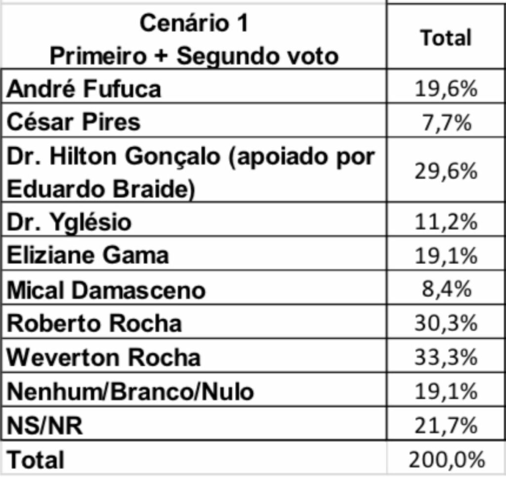 No ranking, lideram Weverton Rocha (14,5%), Roberto Rocha (12,9%) e Eliziane Gama (11,6%), seguidos por André Fufuca (10,4%). Também aparecem Dr. Yglésio (6,7%) e César Pires e Mical Damasceno, ambos com 5,8%.