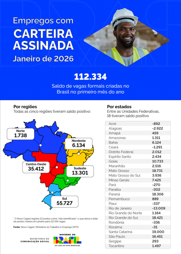 NACIONAL – O Brasil gerou 112.334 novos empregos com carteira assinada em janeiro de 2026, resultado de 2.208.030 admissões e 2.095.696 desligamentos. No acumulado de 12 meses, de fevereiro de 2025 a janeiro de 2026, foram gerados mais de 1,22 milhão de novos postos formais. Com isso, o estoque total de vínculos cresceu 2,6%, passando de 47,34 milhões para 48,57 milhões de trabalhadores formalizados.