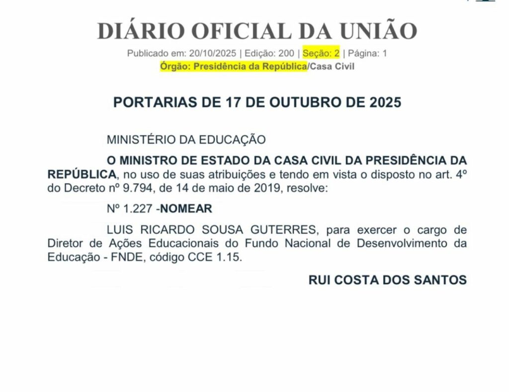 O maranhense Luís Ricardo Sousa Guterres foi nomeado para um cargo de alta direção no Fundo Nacional de Desenvolvimento da Educação (FNDE). Com vasta experiência em gestão pública, no Maranhão e no Distrito Federal, Guterres é agora diretor de Ações Educacionais do Fundo Nacional de Desenvolvimento Social. A nomeação, assinada pelo ministro da Casa Civil da Presidência da República, Rui Costa, foi publicada nesta segunda-feira (20) no Diário Oficial da União (DOU).