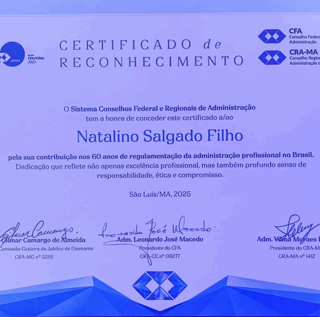 O médico, professor universitário e ex-reitor da Universidade Federal do Maranhão (UFMA) Natalino Salgado Filho recebeu o Certificado de Reconhecimento conferido pelo Sistema Conselhos Federais e Regionais de Administração por ocasião da celebração do Jubileu de Diamante da Administração no Brasil. Ele manifestou grande satisfação ao ser agraciado com a homenagem.