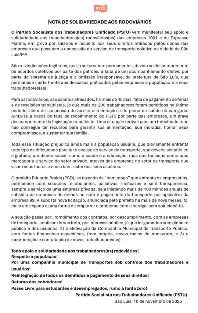 Em nota de solidariedade aos trabalhadores rodoviários das empresas Expresso Rei de França e Marina, em greve há seis dias em protesto contra o não pagamento dos seus salários e outros direitos, o Partido Socialista dos Trabalhadores Unificado (PSTU) apontou o prefeito de São Luís, Eduardo Braide (PSD), como principal culpado pelo caos no transporte público que levou a mais uma paralisação.