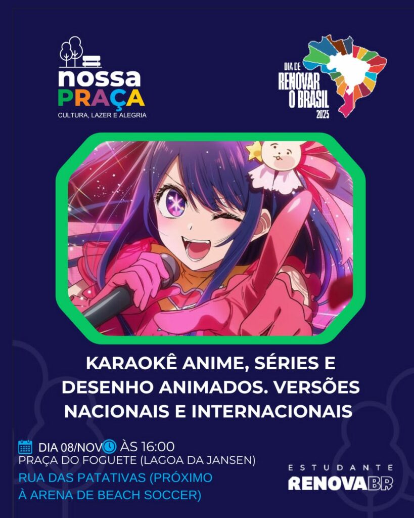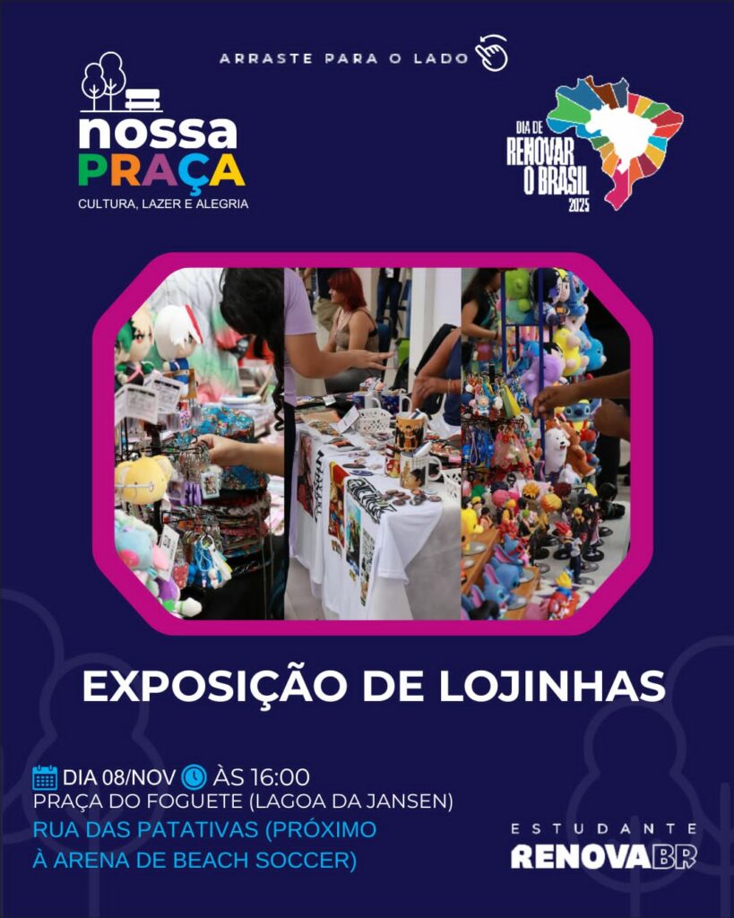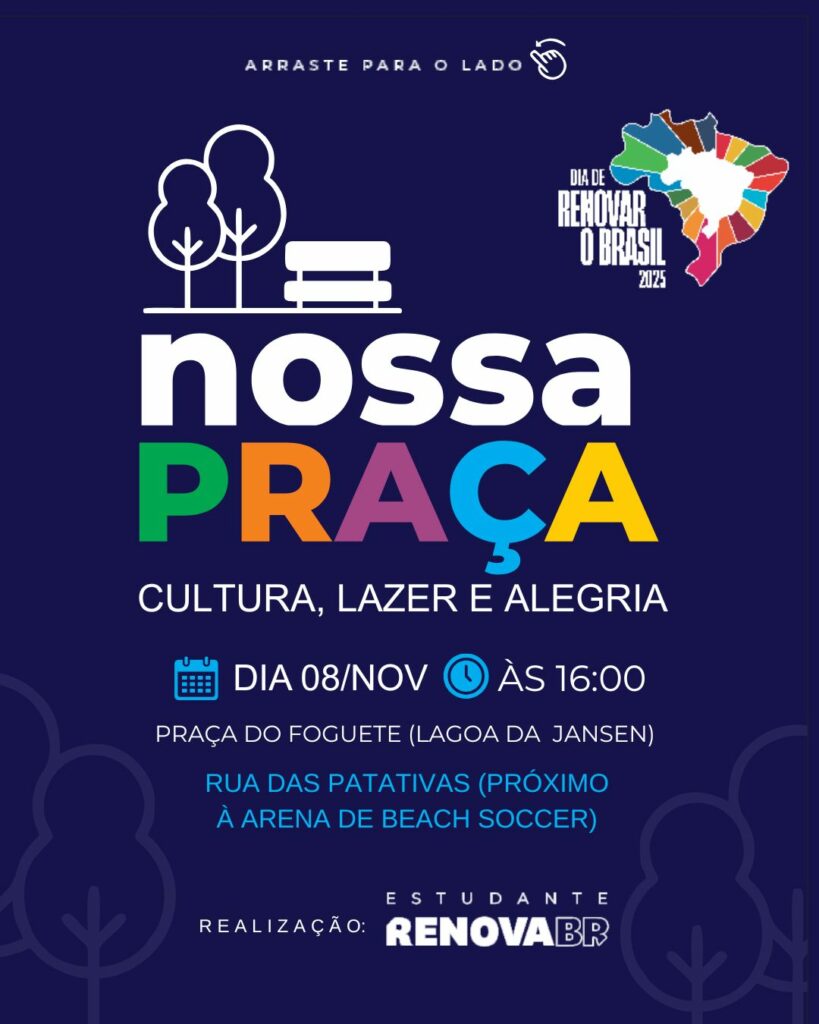 Neste sábado (8), acontece o projeto Nossa Praça, na Lagoa da Jansen. O evento faz parte do Dia de Renovar o Brasil, do Curso de Formação de Líderes do RenovaBR. O RenovaBR é a maior escola de formação de lideranças públicas do Brasil, mantida através de doações de pessoas físicas, empresas e fundações.
