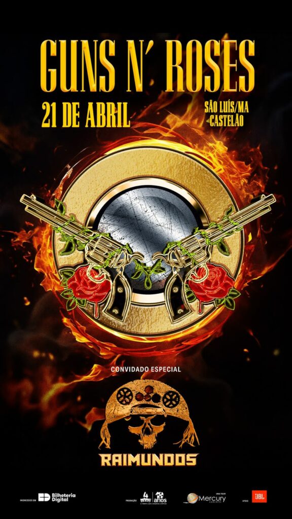 Na sequência, o Guns N’ Roses, uma das maiores e mais influentes bandas da história do rock, sobe ao palco em São Luís com um espetáculo grandioso e ingressos próximos da lotação máxima. Após o sucesso estrondoso de sua última passagem pelo Brasil, o grupo americano retorna com uma série de shows inéditos no país, incluindo participação no Monsters of Rock e uma apresentação emblemática na capital maranhense.