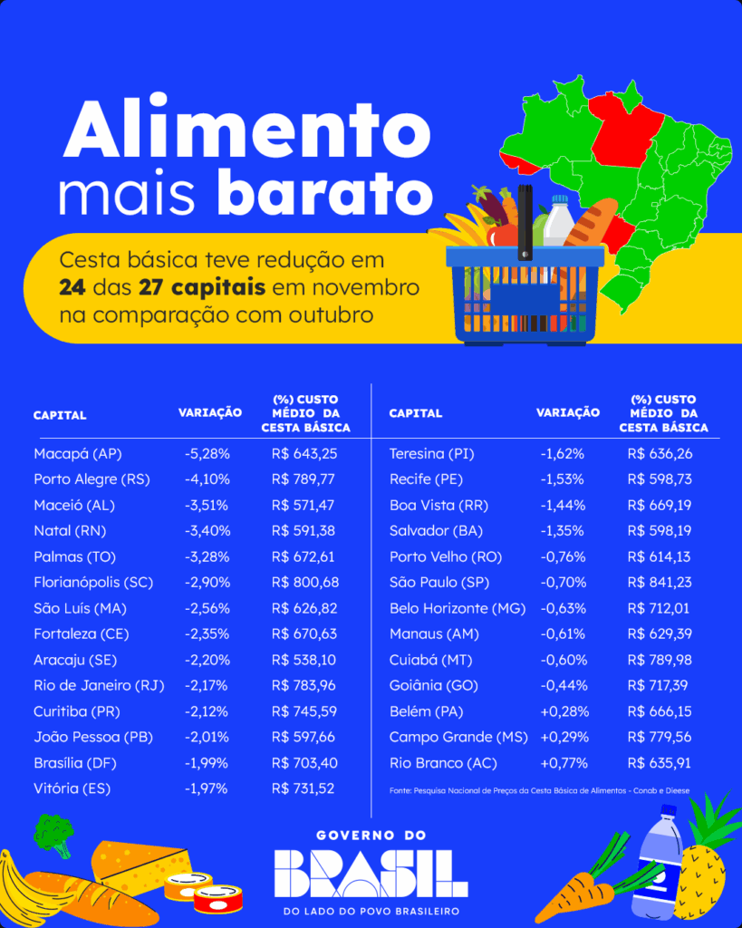 NACIONAL – Na avaliação nacional, em novembro, o valor dos alimentos básicos caiu, entre outubro e novembro, em 24 das 27 capitais onde a pesquisa é realizada, com destaque para Macapá (-5,28%), Porto Alegre (-4,10%), Maceió (-3,51%), Natal (-3,40%) e Palmas (-3,28%). No acumulado no ano, entre dezembro de 2024 e outubro de 2025, nove capitais registram queda no preço da cesta básica, com destaque para Brasília (-5,35%), Natal (-4,20%) e Aracaju (-2,88%).