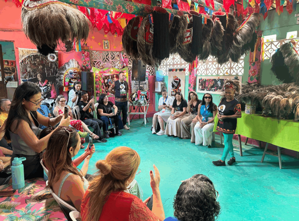 Em seguida, a comitiva seguiu para o Roteiro Quilombo Cultural da Liberdade, um dos mais fortes símbolos da cultura viva de São Luís. No território do Boi da Floresta, os participantes foram recebidos pela coordenadora Nadir Cruz, que apresentou bordados, ofícios, técnicas e elementos que compõem o universo do bumba meu boi e o sotaque da baixada.