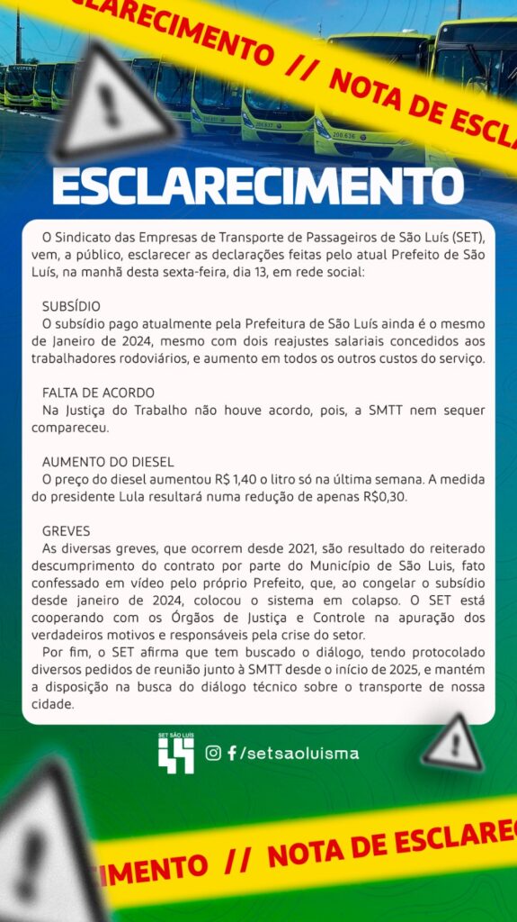 O Sindicato das Empresas de Transporte de Passageiros de São Luís (SET), vem, a público, esclarecer as declarações feitas pelo atual Prefeito de São Luís, Eduardo Braide, na manhã desta sexta-feira, dia 13, em rede social: