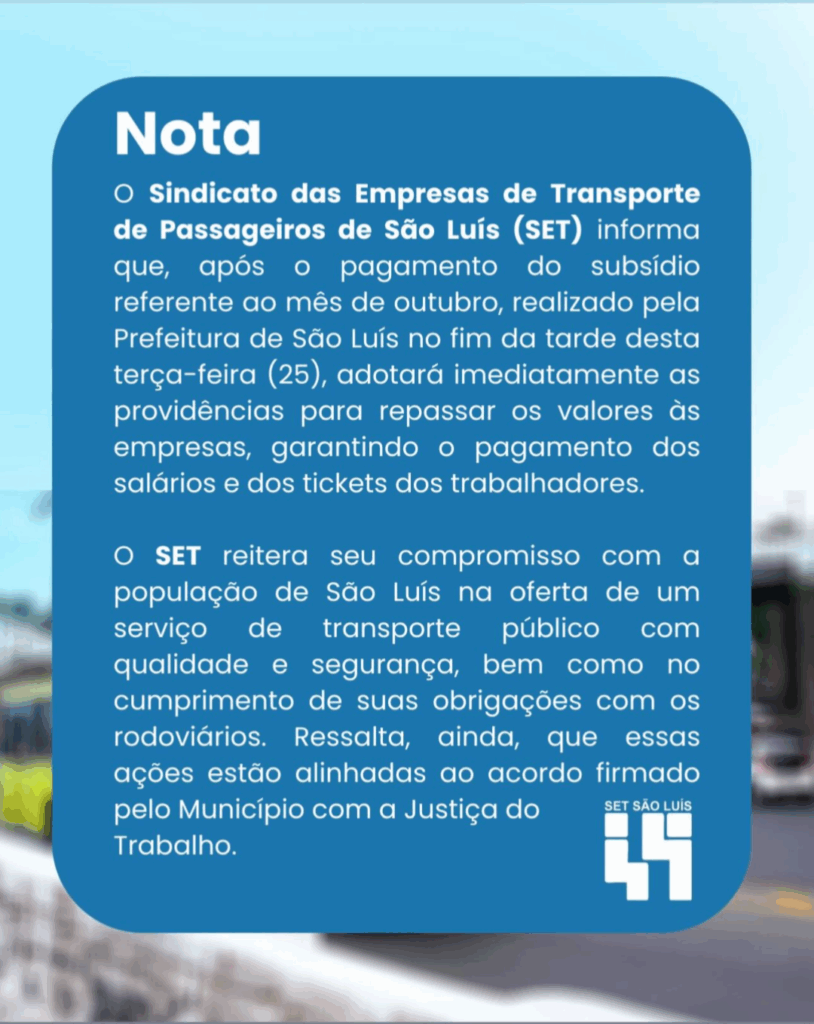 O Sindicato das Empresas de Transporte de Passageiros de São Luís (SET) informa que, após o pagamento do subsídio referente ao mês de outubro, realizado pela Prefeitura de São Luís no fim da tarde desta terça-feira (25), adotará imediatamente as providências para repassar os valores às empresas, garantindo o pagamento dos salários e dos tickets dos trabalhadores.