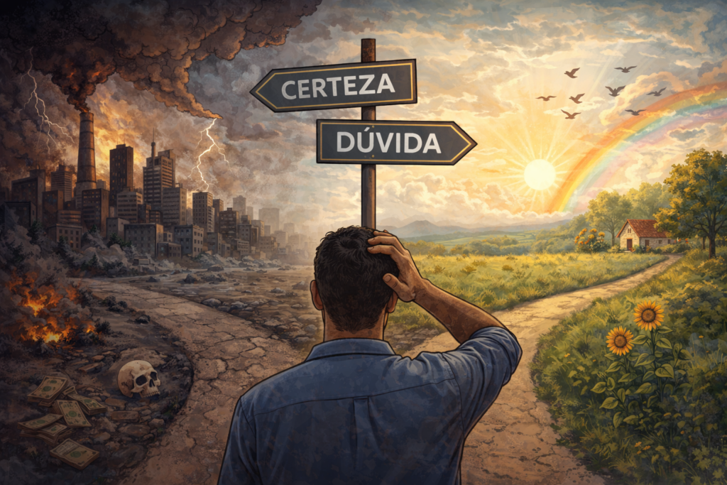Talvez a questão central não seja escolher entre certeza e dúvida, mas compreender que, em determinados momentos históricos, a dúvida não é fraqueza, mas a única forma possível de lucidez. Porque, entre a certeza da ruína e a incerteza da possibilidade, é precisamente na dúvida que ainda reside a chance de não aceitar o pior como destino.